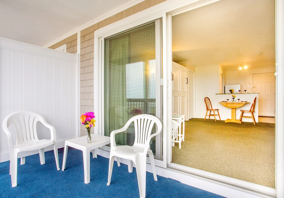 Our bayfront studio units feature a full-size Murphy bed and full-size sleep sofa, sleeping up to 4 guests. Each unit includes a kitchenette, dining area, and full bathroom, with a walkout patio offering direct views of Cape Cod Bay and easy access to the sand beach.